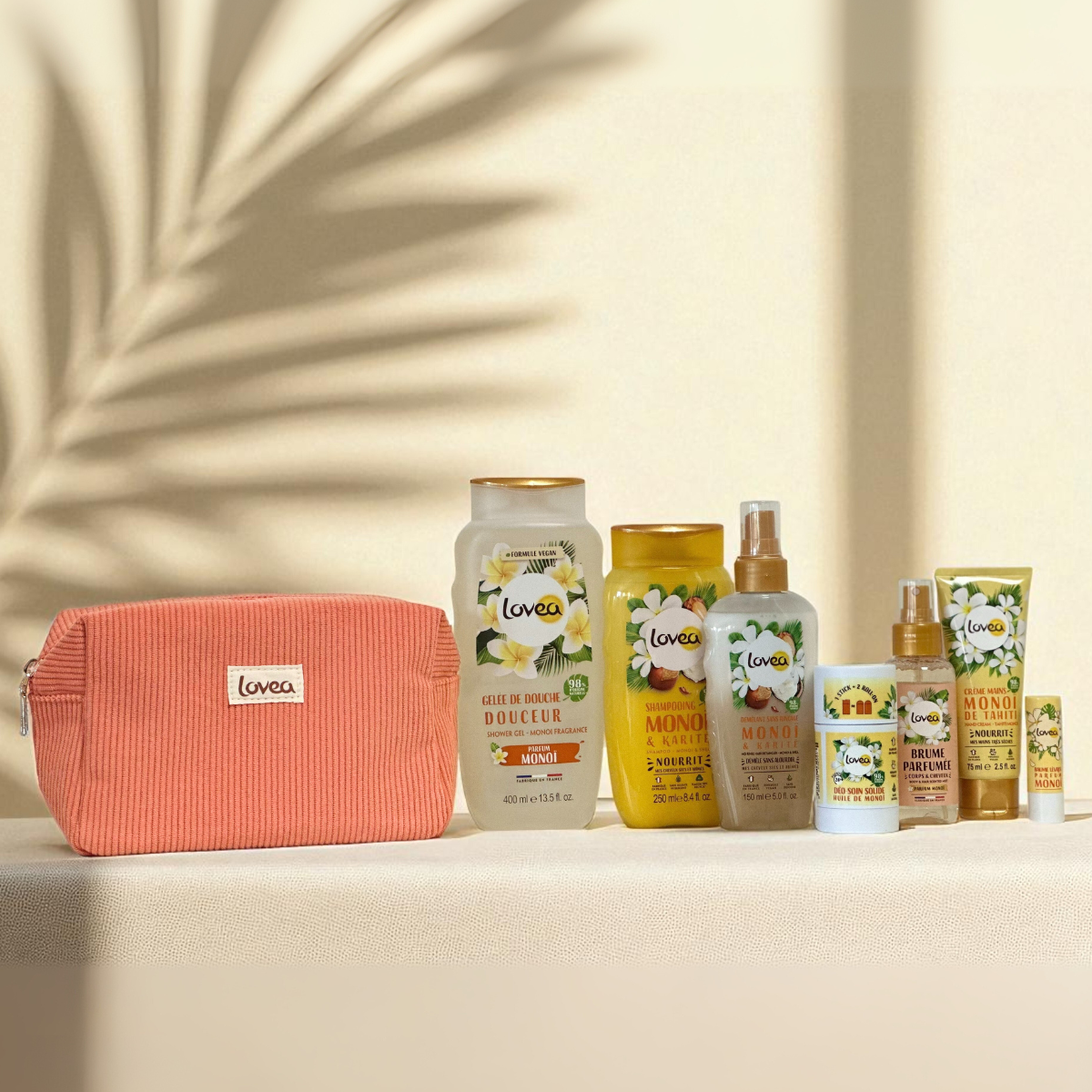 La Trousse Essentiels Beauté Lovea, présentée dans une jolie trousse en velours côtelé, réunit une sélection de soins parfumés au Monoï pour prendre soin de la peau et des cheveux au quotidien, dans une routine sensorielle et ensoleillée.