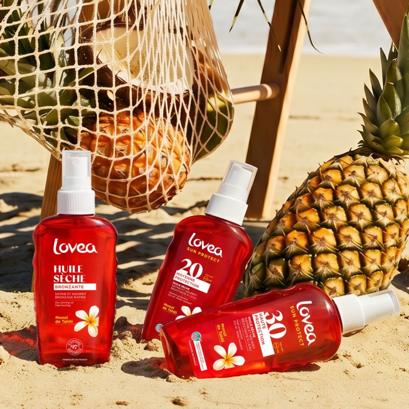 Monoï oil alone does not protect against the sun's rays. In Lovea protective oils, it's the addition of a sun filter to our dry oils that helps protect your skin from UVA & UVB rays.