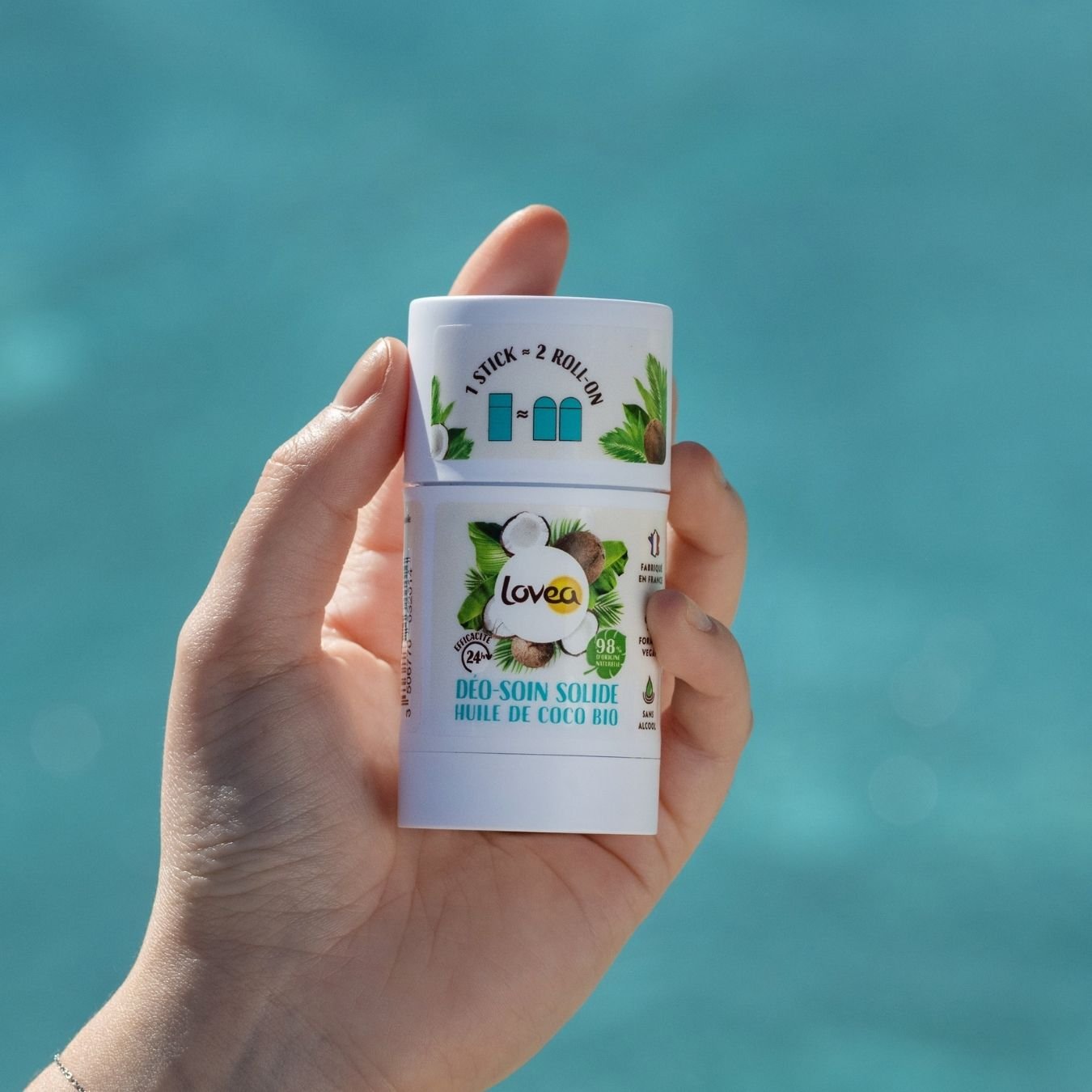 Lovea Organic Coconut Oil Deo-Soin Solide. A deodorant with a skincare action, effective for 24 hours. Its melting texture makes it easy to spread without drying out, leaving your skin soft and supple. Its Coco fragrance, with its fresh, gourmand notes, will transport you straight to the coconut trees. Its vegan formula, 98% natural origin and alcohol-free, is enriched with Organic Coconut Oil for a sensation of care and comfort. This vegan deodorant is made in France and dermatologically tested. It is suitable for daily use. Its solid stick format is entirely recyclable and is advantageous: 1 Stick ≈ 2 Roll-On!