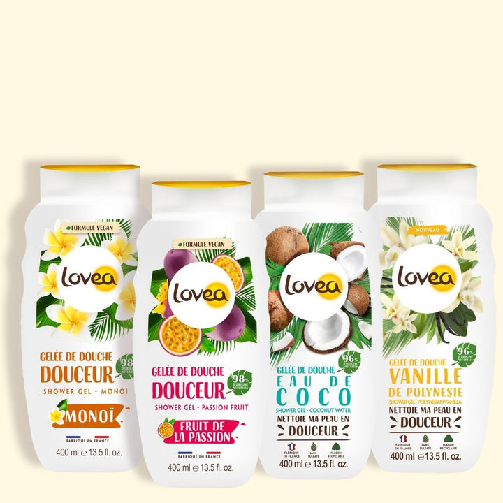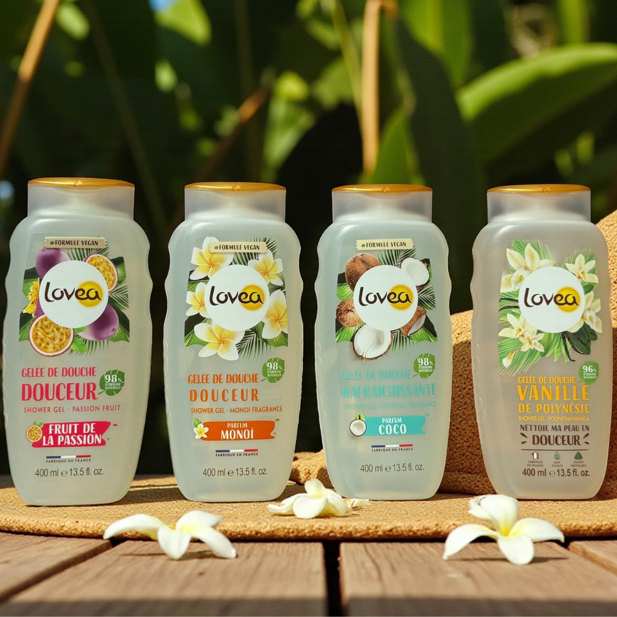 Envie de voyager depuis ta salle de bain ? Laisse-toi emporter par l’Assortiment Découverte de Douches Exotiques Lovea, une routine sensorielle composée de 4 Gelées de Douche aux parfums envoûtants : Monoï, Fruit de la Passion, Vanille de Polynésie et Eau de Coco. Formulées à 98 % d’ingrédients d’origine naturelle, ces gelées de douches vegan nettoient ta peau en douceur tout en la parfumant délicatement. Leur texture fondante se transforme en une mousse légère et onctueuse, pour un vrai moment d’évasion sous la douche.