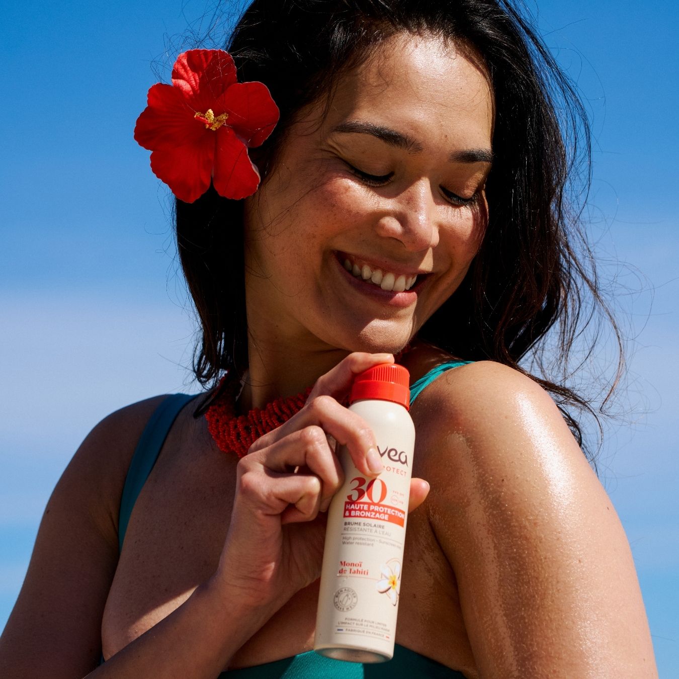 Cette brume solaire FPS 30 au Monoï de Tahiti offre une haute protection solaire et active le bronzage. Sa texture légère et résistante à l'eau protège des rayons UVA et UVB en un geste rapide. La brume solaire visage et corps laisse la peau protégée et délicatement parfumée au Monoï.